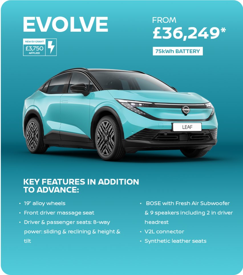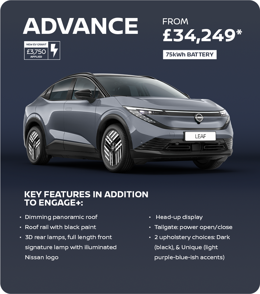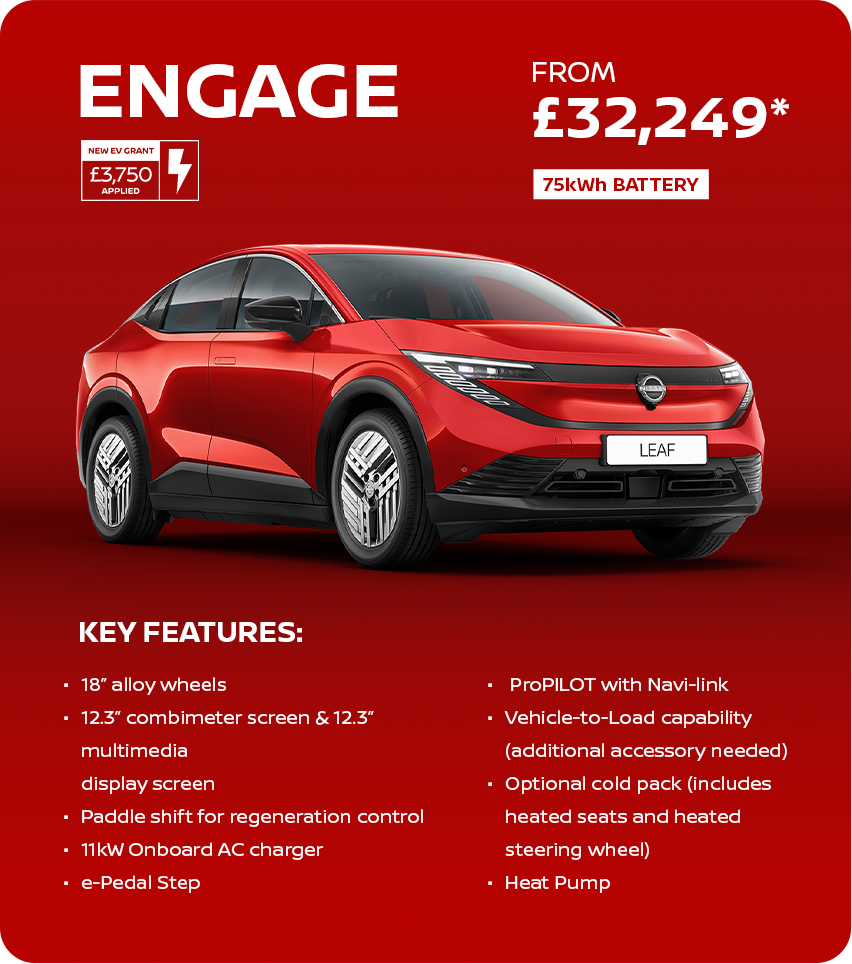 *Electric Car Grant (ECG) of £3,750. ECG scheme subject to UK Government terms and conditions. Prices ranging from price of £32,249 is based on a Nissan LEAF 75kWh Engage excl. cost of optional paint & personalisation.